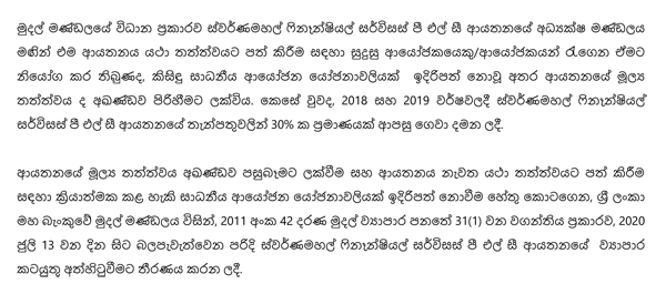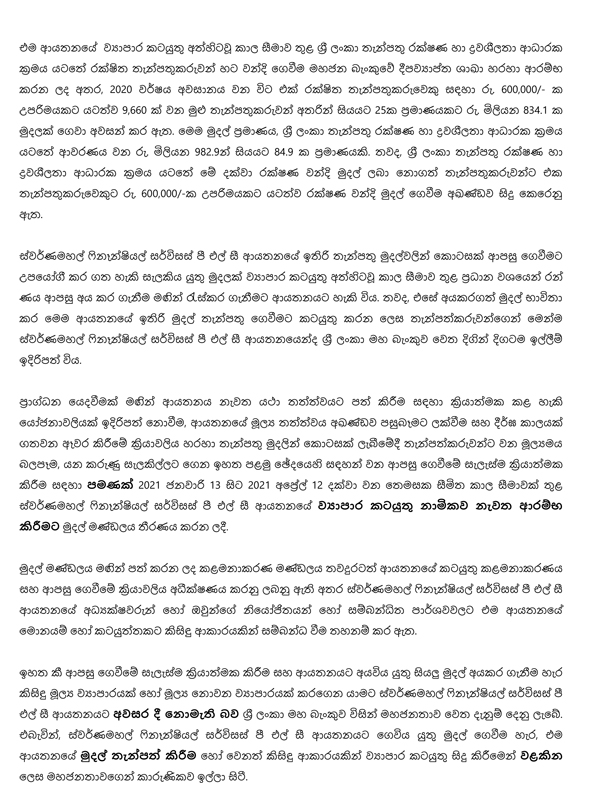 ශ්රී ලංකා මහ බැංකුවේ මුදල් මණ්ඩලය විසින් මහජනතාවගේ සහ ආයතනයේ තැන්පත්කරුවන්ගේ යහපත සඳහා දැඩි කොන්දේසිවලට යටත් ව, 2011 අංක 42 දරණ මුදල් ව්යාපාර පනතේ 31(5)(අ) වන වගන්තිය ප්රකාර ව, සීමිත අරමුණක් සහ සීමිත කාලයක් සඳහා මුදල් මණ්ඩලය විසින් පත් කරන ලද කළමනාකරණ මණ්ඩලයේ අධීක්ෂණය යටතේ ආයතනයේ පවත්නා ඉතිරි තැන්පතුවලින් සියයට 50ක ප්රමාණයක් ආපසු ගෙවීම (ආපසු ගෙවීමේ සැලැස්ම) සඳහා පමණක් 2021 ජනවාරි 13 සිට 2021 අප්රේල් 12 දක්වා වන තෙමසක සීමිත කාල සීමාවක් තුළ ස්වර්ණමහල් ෆිනෑන්ෂියල් සර්විසස් පී එල් සී ආයතනයේ ව්යාපාර කටයුතු නාමික ව නැවත ආරම්භ කිරීමට තීරණය කළේ ය.