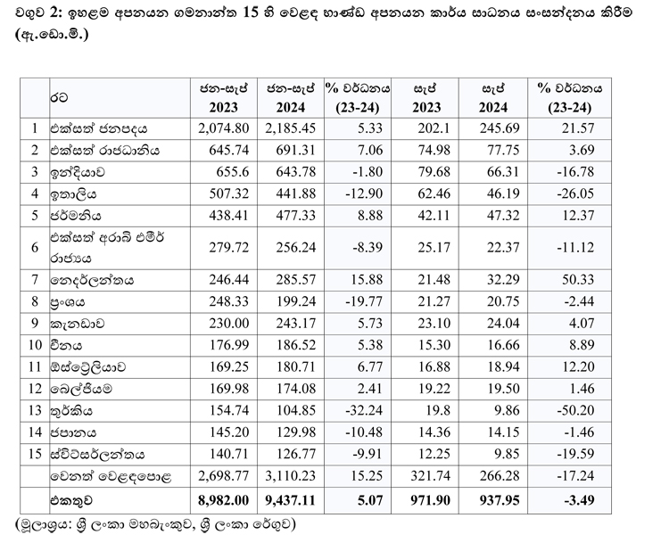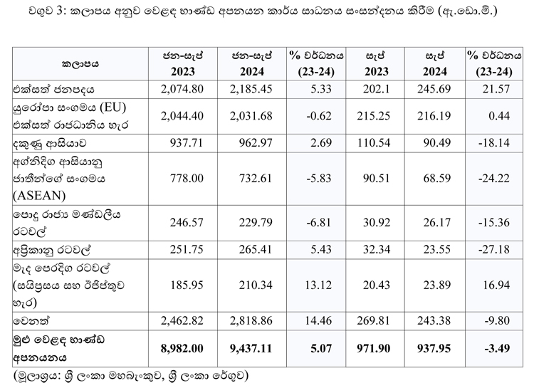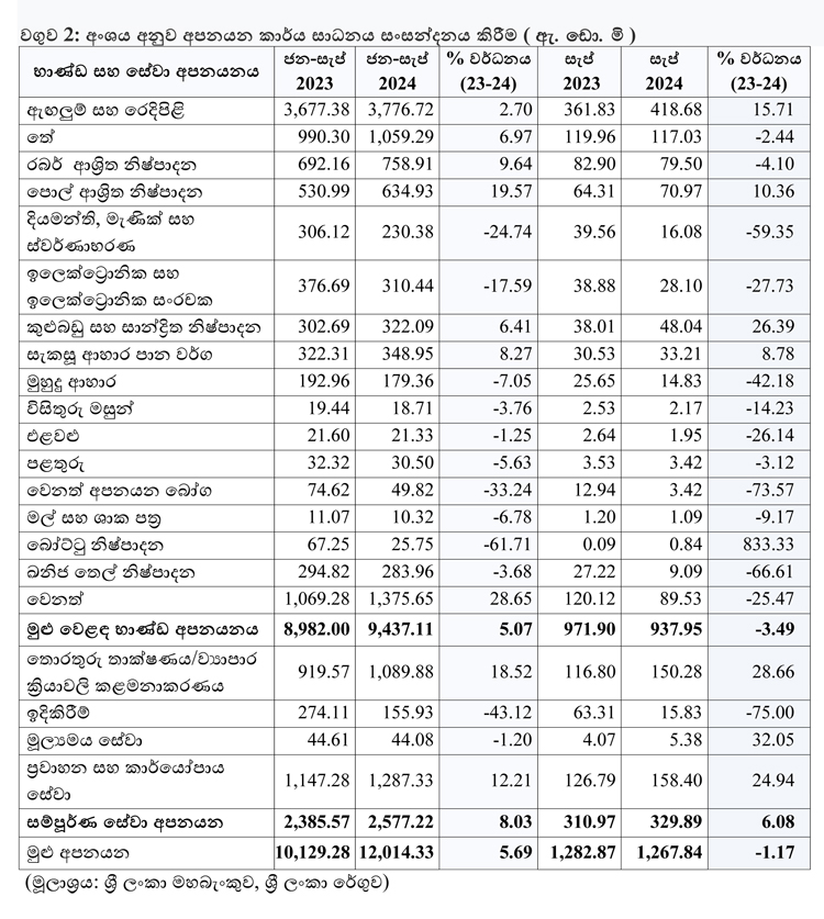 ඒ අනුව 2024 සැප්තැම්බර් මාසය සඳහා වෙළඳ භාණ්ඩ සහ සේවා යන දෙකම ඇතුළුව මුළු අපනයනය, 2023 අනුරූප කාලපරිච්ඡේදයට වඩා 1.17% කින් අඩුවෙමින් ඇමෙරිකානු ඩොලර් මිලියන 1,267.84 ක් ලෙස වාර්තා විය.