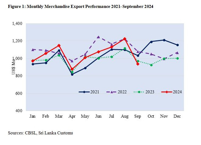 ශ්රී ලංකා රේගුව විසින් නිකුත් කරන ලද තාවකාලික දත්ත වලට අනුව, 2024 සැප්තැම්බර් මාසයේදී වෙළඳ භාණ්ඩ අපනයන කාර්ය සාධනය ඇමෙරිකානු ඩොලර් මිලියන 937.95 ක් වූ අතර එය 2023 සැප්තැම්බර් මාසයට සාපේක්ෂව 3.49% ක අඩුවීමක් වාර්තා කළේය.