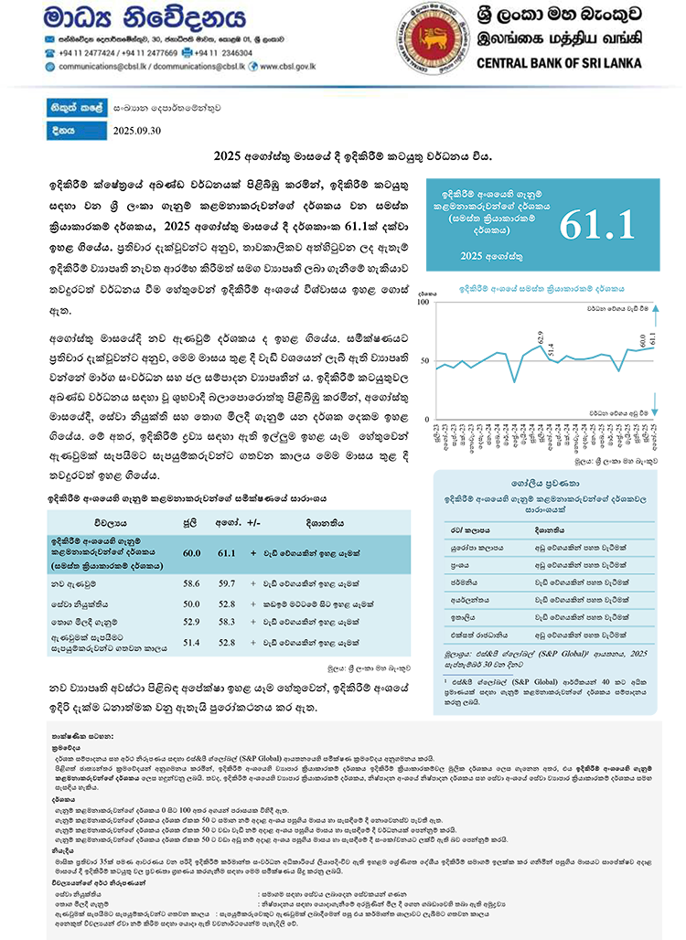 ඉදිකිරීම් ක්ෂේත්‍රයේ අඛණ්ඩ වර්ධනයක් පිළිබිඹු කරමින්, ඉදිකිරීම් කටයුතු සඳහා වන ශ්‍රී ලංකා ගැනුම් කළමනාකරුවන්ගේ දර්ශකය වන සමස්ත ක්‍රියාකාරකම් දර්ශකය,  2025 අගෝස්තු මාසයේ දී දර්ශකාංක 61.1ක් දක්වා ඉහළ ගියේය. ප්‍රතිචාර දැක්වූවන්ට අනුව, තාවකාලිකව අත්හිටුවන ලද ඇතැම් ඉදිකිරීම් ව්‍යාපෘති නැවත ආරම්භ කිරීමත් සමග ව්‍යාපෘති ලබා ගැනීමේ හැකියාව තවදුරටත් වර්ධනය වීම හේතුවෙන් ඉදිකිරීම් අංශයේ විශ්වාසය ඉහළ ගොස් ඇත.