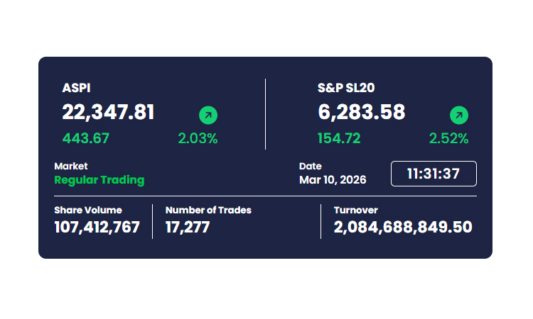 මේ අතර අද පෙරවරු 11.30 පමණ විට මුල් පැය දෙක තුළ දී මෙරට එකම කොටස් වෙළෙඳපොළ වන කොළඹ කොටස් වෙළෙඳපොළේ ප්රධාන මිල දර්ශකය ඒකක 443ක වර්ධනයක් අත්පත් කර ගැනීමට සමත්ව තිබුණු අතර රු. බිලියන 2 ඉක්ම වූ දෛනික පිරිවැටුමක් ඒ වන විට වාර්තා වී තිබුණි.