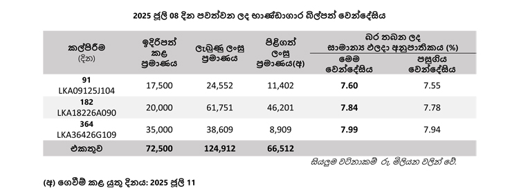 අද වෙන්දේසිය සඳහා රු. මිලියන 72,500ක භාණ්ඩාගාර බිල්පත් ප්‍රමාණයක් වෙන්දේසිය සඳහා ඉදිරිපත් කර තිබුණු අතර රු. මිලියන 124,912ක ලංසු ප්‍රමාණයක් ඊට ලැබී තිබුණි.