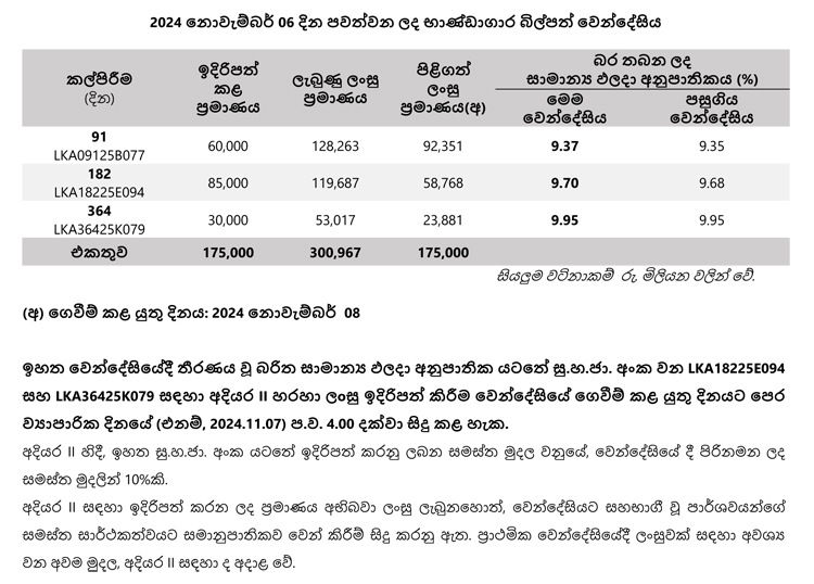 ශ්රී ලංකා මහ බැංකුවේ රාජ්ය ණය දෙපාර්තමේන්තුව අද (06) දිනයේ දී රු. මිලියන 175,000 ක භාණ්ඩාගාර බිල්පත් වෙන්දේසියක් කැඳවා තිබුණි.