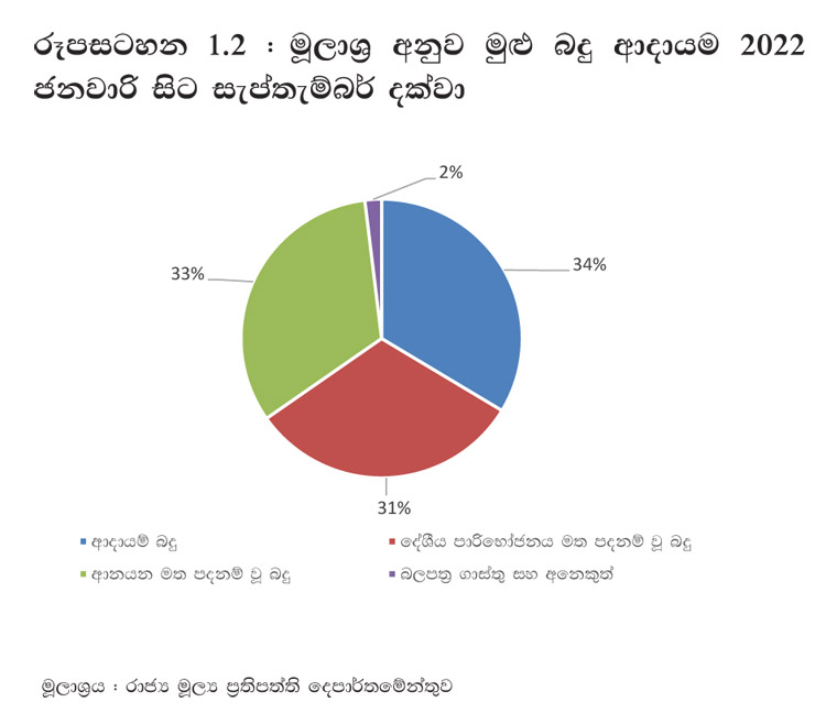 විකුණුම් හා ගාස්තු වලින් ලද ආදායම, 2022 වසරේ පළමු මාස නවය තුළ රු. බිලියන 56.8 ක් දක්වා සියයට 214.6 කින් සැළකිය යුතු ලෙස වැඩි වුණු අතර, මහ බැංකුවේ ලාභ පැවරුම්වලින් ලද ආදායම රු. බිලියන 30.0 ක් විය. කුලී ආදායම සියයට 38.6 කින් රු. බිලියන 4.7 දක්වා ද, ලාභ හා ලාභාංශ මඟින් ලද ආදායම සියයට 17.0 කින් රු. බිලියන 18.9 දක්වා ද, සමාජ ආරක්ෂණ දායකත්වයන් මඟින් ලද ආදායම සියයට 9.6 කින් රු. බිලියන 27.7 දක්වා ද, පොළී ආදායම සියයට 7.6 කින් රු. බිලියන 4.6 දක්වා ද, වෙනත් බදු නොවන ආදායම් මාර්ගවලින් ලද ආදායම සියයට 33.0 කින් රු. බිලියන 22.4 දක්වා ද වශයෙන් අනෙකුත් බදු නොවන ආදායම් මාර්ගවලින් ලද ආදායම ද වැඩි විය.