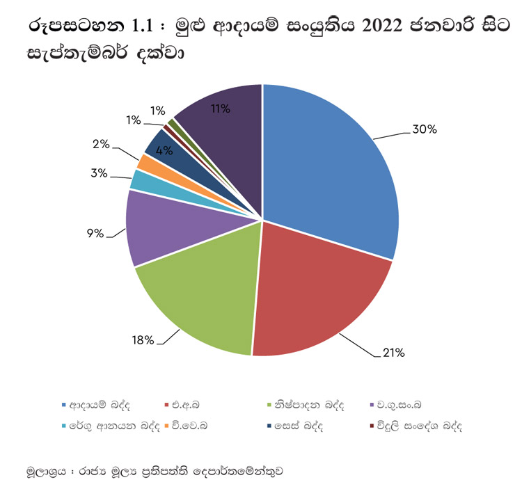 ආදායම් බදු ආදායම, 2021 වසරේ පළමු මාස නවය තුළ වූ රු. බිලියන 209.5 සිට 2022 වසරේ සමාන කාලපරිච්ඡේදය තුළ දී රු. බිලියන 431.8 දක්වා සියයට 106.1 කින් වැඩි විය. තාවකාලික පියවරක් ලෙස ආදායම වැඩි කිරීම සඳහා එක් වරක් අය කරනු ලබන බද්දක් ලෙස, 2020/21 තක්සේරු වර්ෂය සඳහා බදු අය කළ හැකි ආදායම රු. මිලියන 2,000 ඉක්මවන ලද පුද්ගලයන්ගෙන් සහ සමාගම් වලින් අය කරන ලද සියයට 25 ක් වූ අධිභාර බද්දෙන් ලැබූ රු. බිලියන 120.7 මේ සඳහා සැළකිය යුතු ලෙස හේතු විය. මෙයට අමතරව, පුද්ගල හා සංස්ථාපිත බදු වලින් එකතු කරන ලද ආදායම පිළිවෙළින් සියයට 16.4 කින් සහ සියයට 46.1 කින් වර්ධනය විය.