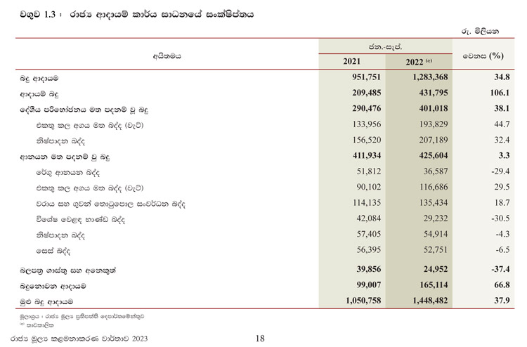 බදු ආදායම, සමස්ත ආදායම සඳහා සියයට 88.6 ක දායකත්වයක් දැක්වූ අතර 2022 වසර සඳහා සංශෝධිත ඇස්තමේන්තුවෙන් සියයට 69.3 ක ළඟා කර ගැනීමකි.