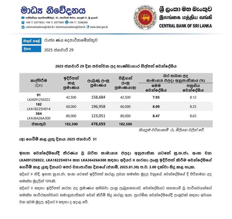 ශ්රී ලංකා මහ බැංකුවේ රාජ්ය ණය දෙපාර්තමේන්තුව පසුගිය ජනවාරි 29 දා රු. මිලියන 182,500ක භාණ්ඩාගාර බිල්පත් වෙන්දේසියක කැඳවා තිබුණි.