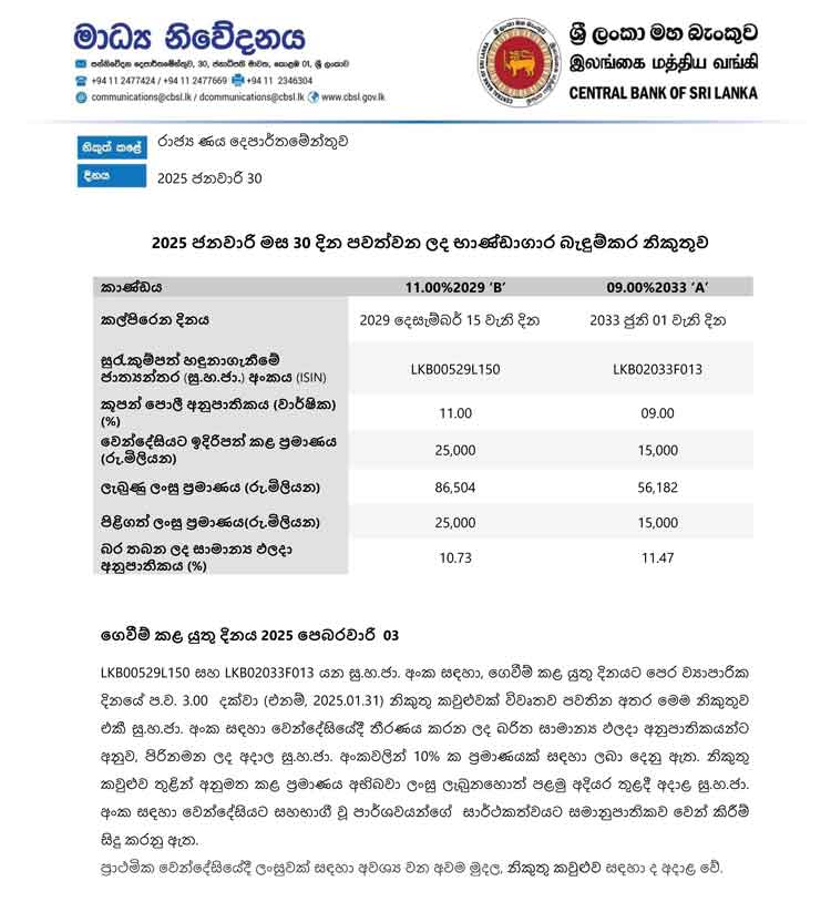 මේ අතර ශ්රී ලංකා මහ බැංකුවේ රාජ්ය ණය දෙපාර්තමේන්තුව විසින් ඊයේ (30) දිනයේ දී රු. මිලියන 40,000 ක භාණ්ඩාගාර බැඳුම්කර වෙන්දේසියක් ද පවත්වන ලදී. 2029 දෙසැම්බර් 15 වැනි දින හා 2033 ජූලි 01 දින කල්පිරෙන ආකාරයෙන් කාණ්ඩ දෙකක් යටතේ බැඳුම්කර නිකුත් කිරීමට එහිදී පියවර ගෙන තිබුණි.