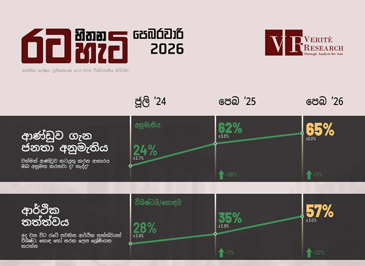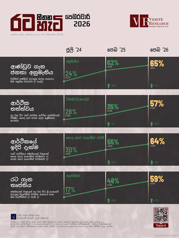 වේරිටේ රිසර්ච් (Verité Research) ආයතනය විසින් පවත්වනු ලබන ගැලප් (Gallup) මාදිලියේ “රට හිතන හැටි” (Mood of the Nation) නවතම මත විමසුමට අනුව, 2026 පෙබරවාරි මාසයේ මුල් භාගය වන විට ආණ්ඩුව ගැන ජනතා අනුමැතිය  65% ක් ලෙස වාර්තා වී ඇත.  මේ අනුව, ජනතා අනුමැතිය  ප්‍රතිශතාංක ±3  ක ආන්තික දෝෂයකට යටත්ව මීට වසරකට පෙර පැවති 62% ක අගයට සාපේක්ෂව සංඛ්‍යානමය වශයෙන් ස්ථායි මට්ටමක පවතී. මෙම මත විමසුම සඳහා දත්ත එකතු කිරීම වැන්ගාඩ් සර්වේ (Vanguard Survey (Pvt) Ltd) ආයතනය විසින් කරන ලදී.