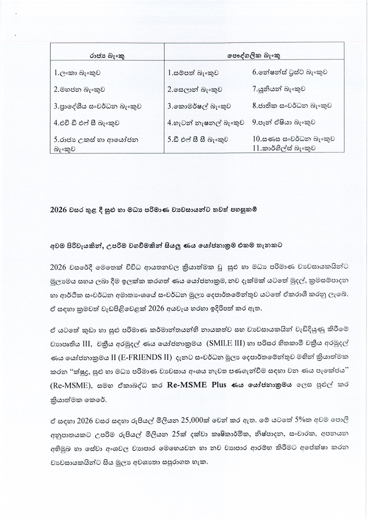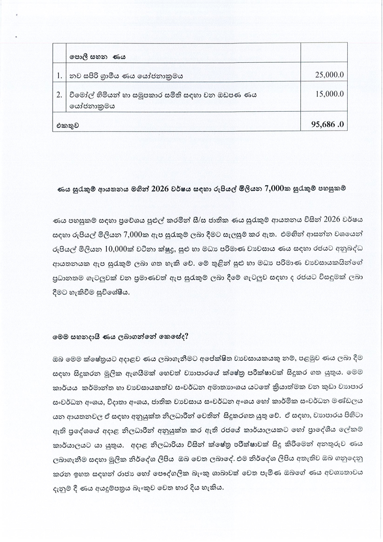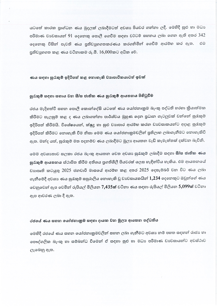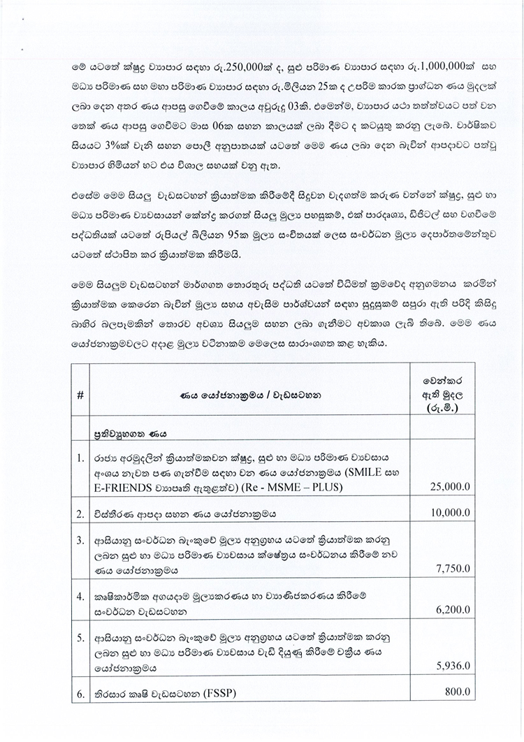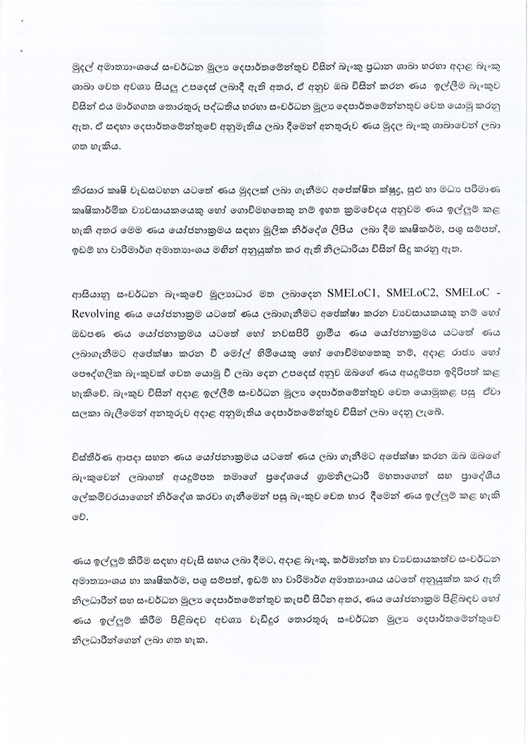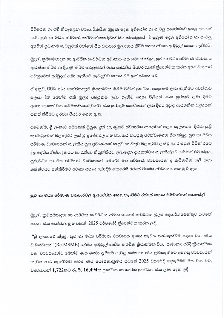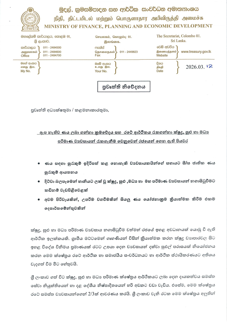 ඇප නැතිව ණය ලබා ගන්නා ක්රමවේදය සහ රටේ ආර්ථිකය රැකගන්නා ක්ෂුද්ර, සුළු හා මධ්ය පරිමාණ ව්යවසායයන් රැකගැනීම වෙනුවෙන් රජයෙන් ගෙන ඇති පියවර සම්බන්ධයෙන් මුදල්, ක්රමසම්පාදන සහ ආර්ථික සංවර්ධන අමාත්යාංශය විසින් මාද්ය නිවේදනයක් නිකුත් කර තිබේ.