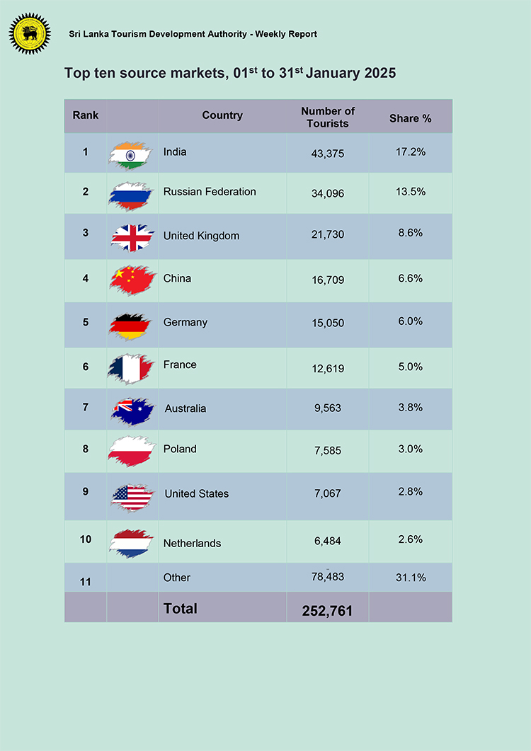 මීට අමතරව රුසියාවෙන් සංචාරකයින් 34,096ක්, එක්සත් රාජධානියෙන් 21,730ක්, චීනයෙන් 16,709ක් ලෙස 2025 ජනවාරි මාසයේ වැඩි වශයෙන් සංචාරකයින් මෙරටට පැමිණ ඇත.