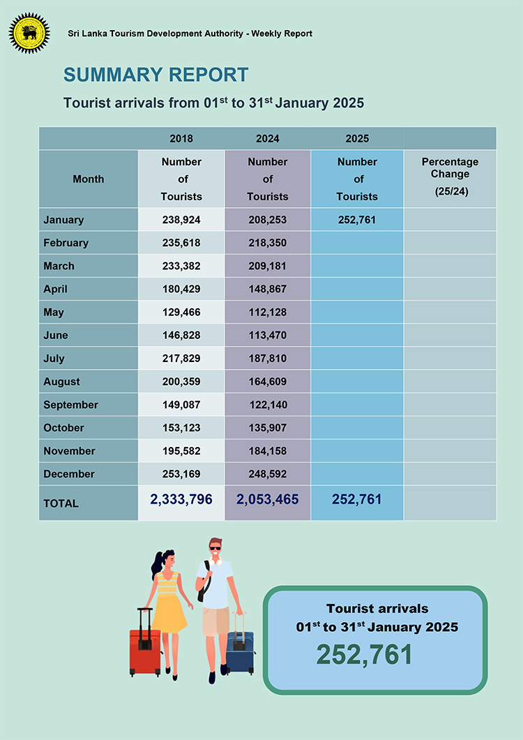 ඒ අනුව ශ්‍රී ලංකා සංචාරක සංවර්ධන අධිකාරිය සිය නවතම දත්ත වාර්තාවන් ඉදිරිපත් කරමින් පෙන්වා දෙන්නේ, 2025 ජනවාරි මාසය තුළ 252,761ක සංචාරකයින් පිරිසක් මෙරටට පැමිණ ඇති බවයි.
