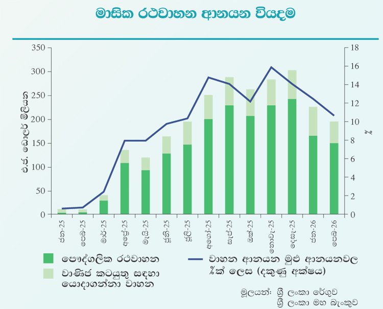 මෙම පියවර පනවා තිබියදීත්, 2025 වසරේ දී වාහන ආනයනය කැපී පෙනෙන ලෙස ඉහළ ගිය අතර, එය ආනයන සීමා කිරීම් හේතුවෙන් වසර ගණනාවක් පුරා අධික ලෙස වර්ධනය වී තිබූ ඉල්ලුම සහ ආර්ථික ක්රියාකාරකම්වල වැඩිදියුණු වීම් පිළිබිඹු කරයි. 2025 වසරේ අප්රේල් මාසයේ සිට ආනයනවල සැලකිය යුතු වර්ධනයක් දක්නට ලැබුණි. එහි ප්රතිඵලයක් ලෙස, පෞද්ගලික වාහන සහ වාණිජ කටයුතු සඳහා යොදා ගන්නා වාහන යන කාණ්ඩ දෙක ම අයත් වාහන ආනයන වියදම් 2025 වසරේ දී එ.ජ. ඩොලර් බිලියන 2.04ක් දක්වා සැලකිය යුතු ලෙස ඉහළ ගිය අතර, එය 2015 වසරේ දී වාර්තා කරන ලද එ.ජ. ඩොලර් බිලියන 2.12 සහ 2018 වසරේ දී වාර්තා වූ එ.ජ. ඩොලර් බිලියන 2.09ට පසු වාර්තා කළ තුන්වන ඉහළ ම වාර්ෂික මුළු වාහන ආනයන වියදම ලෙස වාර්තා විය.