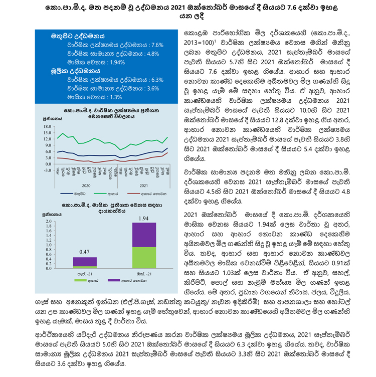 වාර්ෂික සාමාන්ය පදනම මත මනිනු ලබන කො.පා.මි. දර්ශකයෙහි වෙනස 2021 සැප්තැම්බර් මාසයේ පැවති සියයට 4.5හි සිට 2021 ඔක්තෝබර් මාසයේ දී සියයට 4.8 දක්වා ඉහළ ගියේය.