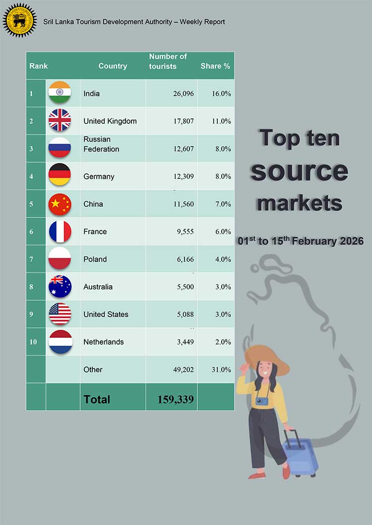 2026 පෙබරවාරි මාසයේ මුල් දින 15 තුළ දී මෙරටට පැමිණ ඇති විදෙස් සංචාරකයින්ගේ සංඛ්යාව 159,339ක් බව ශ්රී ලංකා සංචාරක සංවර්ධන අධිකාරිය සිය නවතම සංඛ්යාලේඛනවලින් අනාවරණය කර සිටී.