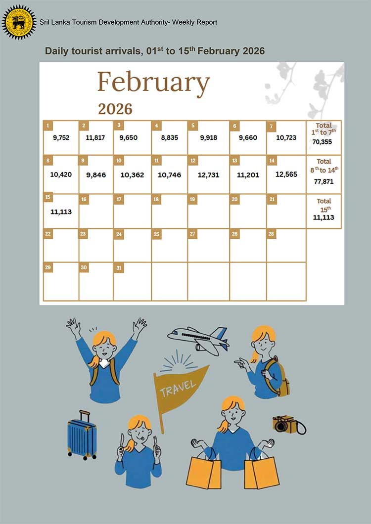 මෙහි ඇති විශේෂත්වය වන්නේ පසුගිය සතිඅන්තයේ දී 35,000 ඉක්මවූ සංචාරකයින් ප්රමාණයක් මෙරටට පැමිණ තිබීමයි. ඒ පෙබරවාරි 13 සිකුරාදා - 11,201ක්, පෙබරවාරි 14 සෙනසුරාදා - 12,565ක් සහ පෙබරවාරි 15 ඉරිදා 11,113ක් ලෙසිනි. ඒ අනුව සතිඅන්තයේ පැමිණි සමස්ත සංචාරකයින් සංඛ්යාව 34,879ක් වේ.
