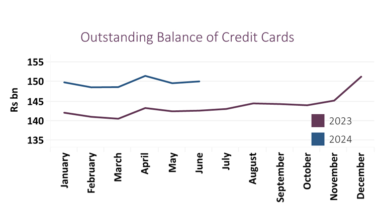මේ අතර මෙම ක්රෙඩිට් කාඩ්පත් වෙනුවෙන් 2024 ජූනි මාසය අවසන් වන විට හිඟව ඇති මුළු මුදල් ප්රමාණය රු. මිලියන 150,151 ක් ලෙසින් වාර්තා වී තිබේ. මෙය 2024 මැයි මාසය අවසන් වන විට සටහන්ව පැවතියේ රු. මිලියන 149,686 ක් ලෙසිනි. ඒ අනුව ක්රෙඩිට් කාඩ්පත් වෙනුවෙන් වාර්තා වන හිඟ මුදල් ප්රමාණය රු. මිලියන 465 කින් ජූනි මාසය තුළ දී ඉහළ ගොස් ඇත. මෙය 0.31% ක වර්ධනයකි.