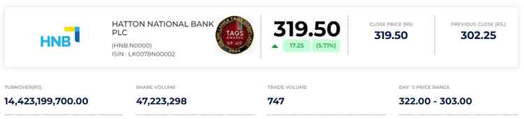 මෙහි දී හැටන් නැෂනල් බැංකුවේ කොටසක් රු. 305.00 බැගින් ඡන්ද බලය හිමි සාමාන්‍ය කොටස් 45,317,177ක් ගනුදෙනු වී ඇති අතර එම ගනුදෙනුව හරහා රු. බිලියන 13.82 ක පිරිවැටුමක් වාර්තා වී තිබේ. මීට අමතර කොටසක් රු. 320 බැගින් වූ 319,405ක කොටස් ප්‍රමාණයක් ද අද පස්වරුවේ, ගිවිසා ගනු ලැබූ ගනුදෙනු දෙකක් හරහා හුවමාරු වී තිබුණි. සමස්තයක් ලෙස අද දිනයේ දී ගිවිසා ගනු ලැබූ හා සාමාන්‍ය වෙළෙඳපොළ ගනුදෙනු හරහා රු. බිලියන 14.42ක වටිනාකමකින් යුතු හැටන් නැෂනල් බැංකු කොටස් ප්‍රමාණයක් හුවමාරු වී ඇත.
