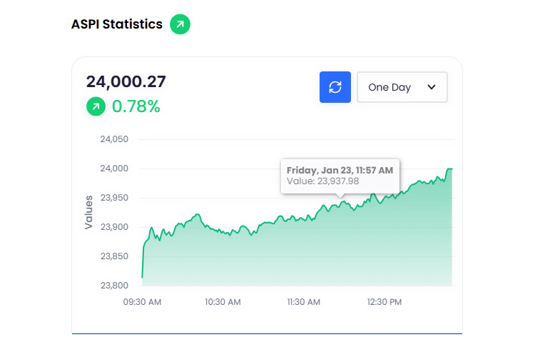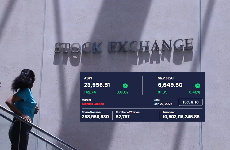 කොළඹ කොටස් වෙළෙඳපොළ මිල දර්ශක අද (23) දින නැවත වරක් ඉතිහාසයේ ඉහළම අගයයන් වාර්තා කිරීමට සමත් වූ අතර එහිදී කැපීපෙනෙන කාරණය වූයේ දිනයේ ගනුදෙනු අතරවාරයේ දී සියලු කොටස් මිල දර්ශකය ඒකක 24,000 සීමාව කරා පැමිණීමයි. කෙසේවෙතත් දිනය නිමාවේ දී එහි අගය ඒකක 23,956.51 ක් ලෙසින් සටහන් වූ අතර එය පෙර දිනයට සාපේක්ෂව ඒකක 142.74ක ඉහළ යාමක් වේ.