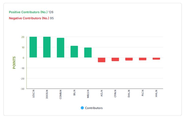 මිල දර්ශකවල ඉහළ යාමට ප්‍රධාන වශයෙන් LOLC හෝල්ඩිංග්ස්, කළම්බු ඩොක්යාර්ඩ්, කොමර්ෂල් බැංකුව, බ්‍රවුන්ස් ඉන්වෙස්ට්මන්ට්ස් හා මෙල්ස්ටාකෝප් යන සමාගම්වල කොටස් මිල ඉහළ යාම් වැඩි දායකත්වයක් ලබා දෙන ලදී.