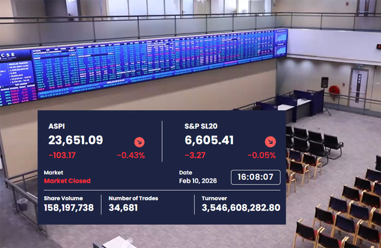අද (10) දිනයේ දී කොළඹ කොටස් වෙළෙඳපොළ සියලු කොටස් මිල දර්ශකයේ ඒකක 103.17ක පහළ යාමක් වාර්තා විය. ඒ අනුව දිනයේ දී ගනුදෙනු අවසානයේ දී සියලු කොටස් මිල දර්ශක අගය ඒ්කක 23,651.09ක් ලෙසින් සටහන් වුණි.