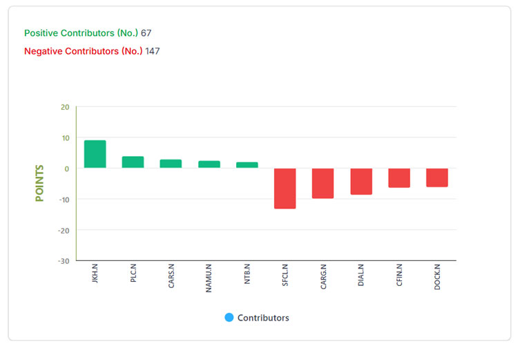 කෙසේවෙතත් ඊට සාපේක්ෂව S&P SL20 දර්ශකයේ සුළු පහළ යාමක් පමණක් දිනය තුළ දක්නට ලැබුණු අතර එහිදී ඒකක 3.27කින් S&P SL20 දර්ශකය පහළ ගොස් දිනයේ ගනුදෙනු අවසානයේ දී ඒකක 6,605.41ක් ලෙසින් සටහන් විය.