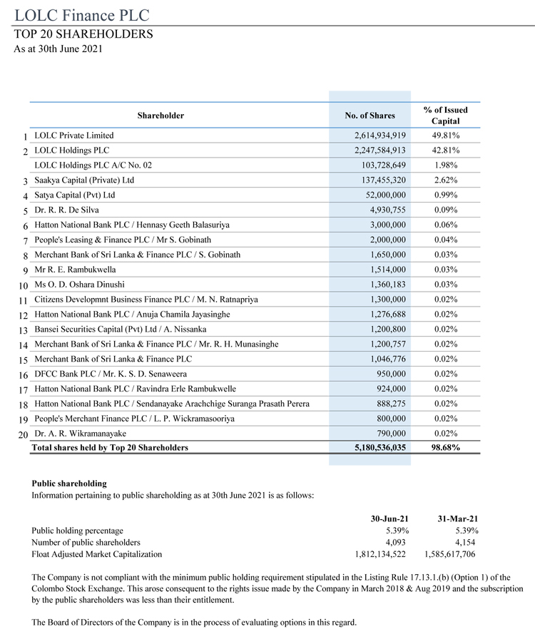 මෙහි දැක්වෙන ආකාරයට සමාගමේ කොටස් ප්‍රාග්ධනයෙන් 98.21% ක්ම ඇත්තේ සමාගමේ ප්‍රමුඛ කොටස්කරුවන් සිව්දෙනා සතුව ය. එය කොටස් වෙළෙඳපොළේ ගනුදෙනු කෙරෙන කොටස් පංගුවට අයත් වන්නේ නැත. එසේම ඉතිරි ප්‍රමුඛ කොටස්කරුවන්ගෙන් සැලකිය යුතු දෙනෙකුගේ ද කොටස් හිමිකාරීත්වයේ අඩුවැඩිවීමක් 2021 ජූනි 30 න් අවසන් කාර්තුව තුළ දී සිදුව නැති බව මූල්‍ය වාර්තා පිරික්සීමේ දී පැහැදිලි වේ. සමාගම පවසන පරිදි සමාගමේ ප්‍රකාශිත කොටස් ප්‍රාග්ධනයෙන් මහජන පංගුව 5.39% කි.