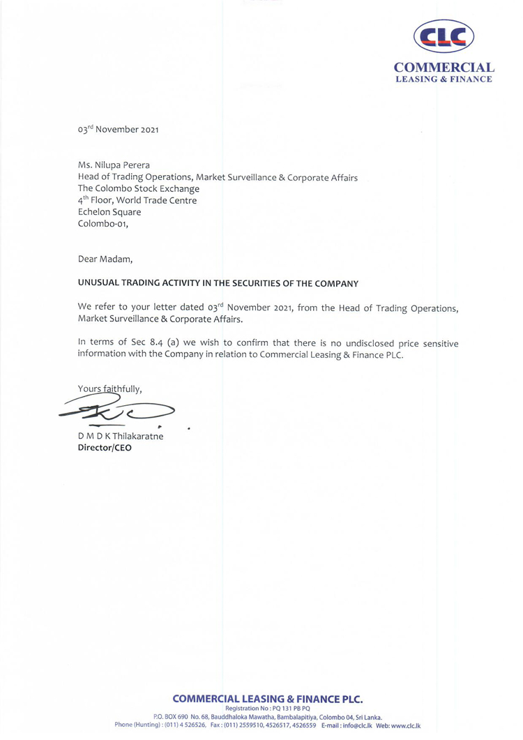 කොමර්ෂල් ලීසිං සමාගමේ කොටස් මිල අසාමාන්‍ය ආකාරයෙන් ඉහළ යාම පිළිබඳව එම සමාගමේ අධ්‍යක්ෂ/ ප්‍රධාන විධායක නිලධාරී ඩී.එම්.ඩී.කේ. තිලකරත්න මහතා පවසන්නේ, සමාගම විසින් අනාවරණය නොකරන ලද කිසිදු මිල සංවේදී තොරතුරක් නොමැති බවයි.