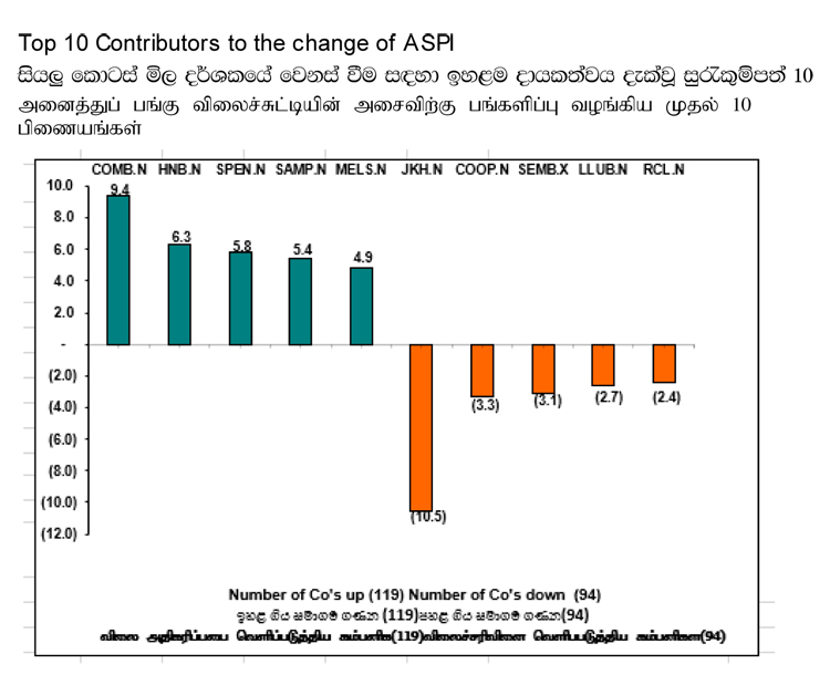 දිනය තුළ සියලු කොටස් මිල දර්ශකයේ හැසිරීමට කොමර්ෂල් බැංකුව, HNB, එයිට්කන් ස්පෙන්ස්, සම්පත් බැංකුව සහ මෙල්ස්ටාකෝප් යන සමාගම්වලින් ඉහළ ධනාත්මක දායකත්වයක් ලැබී තිබුණු අතර ජෝන් කීල්ස් හෝල්ඩිංග්ස් සමාගමේ කොටස් මිල පෙර දිනයට සාපේක්ෂව පහළ ගොස් තිබීම සියලු කොටස් මිල දර්ශකය මන්දගාමී වීමට ප්‍රධාන වශයෙන් හේතු වී තිබෙන බව නිරීක්ෂණය කළ හැකිය.