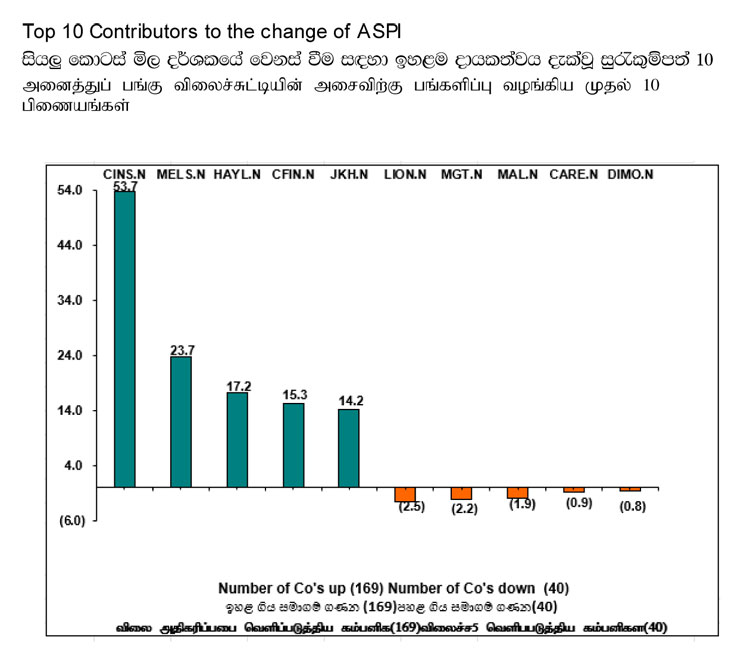 අද දින සියලු කොටස් මිල දර්ශකයේ වර්ධනයට ප්‍රධාන වශයෙන් සෙලින්කෝ හෝල්ඩිංග්ස්, මෙල්ස්ටාකෝප්, හේලීස්, සෙන්ට්‍රල් ෆිනෑන්ස් සහ ජෝන් කීල්ස් හෝල්ඩිංග්ස් යන සමාගම්වල කොටස් මිල ගණන් වර්ධනයන් ඉහළ දායකත්වයක් ලබා දීමට සමත් වූ අතර සමාගම් 169ක කොටස් මිල ගණන් පෙර දිනයට සාපේක්ෂව ඉහළ ගොස් තිබුණි.
