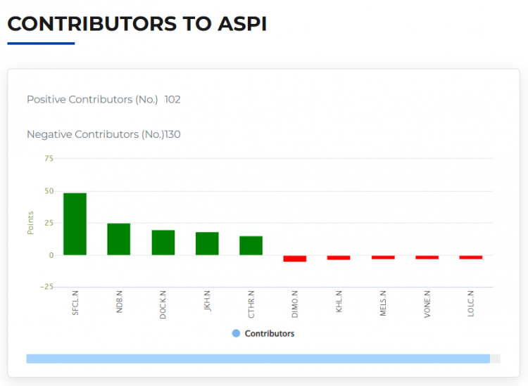 එහි දී සෙන්කඩගල ෆයිනෑන්ස්, NDB බැංකුව, Colombo Dockyard, ජෝන් කීල්ස් හෝල්ඩිංග්ස් සහ CT හෝල්ඩිංග්ස් යන සමාගම් සියලු කොටස් මිල දර්ශකයේ හැසිරීමට ඉහළ ධනාත්මක දායකත්වයක් ලබා දී තිබුණි.