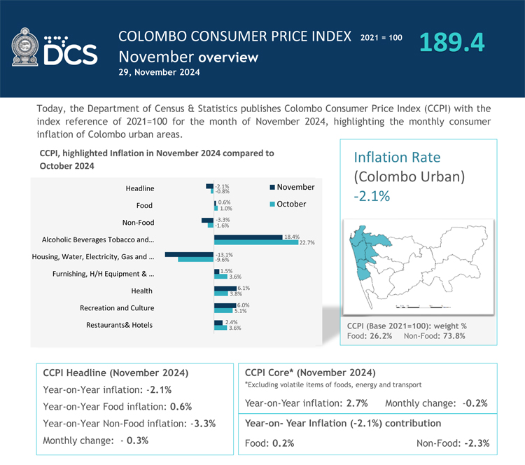 කොළඹ පාරිභෝගික මිල දර්ශකයෙහි (කො.පා.මි.ද., 2021=100) වාර්ෂික ලක්ෂ්යමය වෙනස මගින් මනිනු ලබන මතුපිට උද්ධමනය, ශ්රී ලංකා මහ බැංකුව විසින් සිදු කරන ලද කෙටි කාලීන උද්ධමන පුරෝකථන හා අනුකූලව, අඛණ්ඩව තෙවන මාසයටත් ඍණ අගයක පවතිමින් 2024 ඔක්තෝබර් මාසයේ දී වාර්තා වූ සියයට 0.8ක අවධමනයට සාපේක්ෂව 2024 නොවැම්බර් මාසයේ දී සියයට 2.1ක අවධමනයක් වාර්තා කළේය.