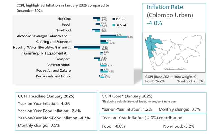 වාර්ෂික ලක්ෂ්යමය පදනම මත, ආහාර කාණ්ඩයේ උද්ධමනය 2024 දෙසැම්බර් මාසයේ දී වාර්තා වූ සියයට 0.8 මට්ටමේ සිට 2025 ජනවාරි මාසයේ දී සියයට 2.6ක අවධමනයක් දක්වා පහළ ගොස් තිබෙන අතර ආහාර නොවන කාණ්ඩයේ උද්ධමනය 2024 දෙසැම්බර් මාසයේ පැවති සියයට 3.0ක අවධමනයට සාපේක්ෂව 2025 ජනවාරි මාසයේ දී 4.7ක අවධමනයක් දක්වා පහළ ගොස් ඇත.