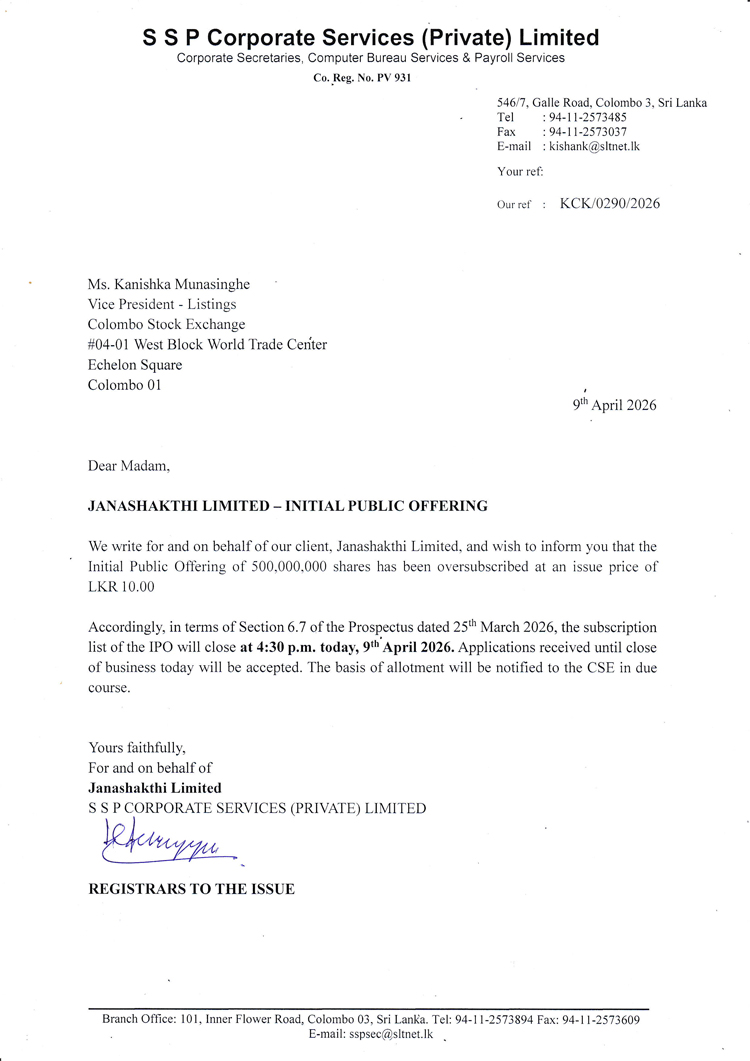 අද (09) දිනයේ දී විවෘත කෙරුණු ජනශක්ති ලිමිටඩ් හි මූලික මහජන කොටස් නිකුතුව සඳහා අධිදායකත්වයක් ලැබී ඇති බව මෙම නිකුතුවේ රෙජිස්ට්රාර් සමාගම වන SSP Corporate Services විසින් කොළඹ කොටස් වෙළෙඳපොළ වෙත දැනුම් දී සිටී.