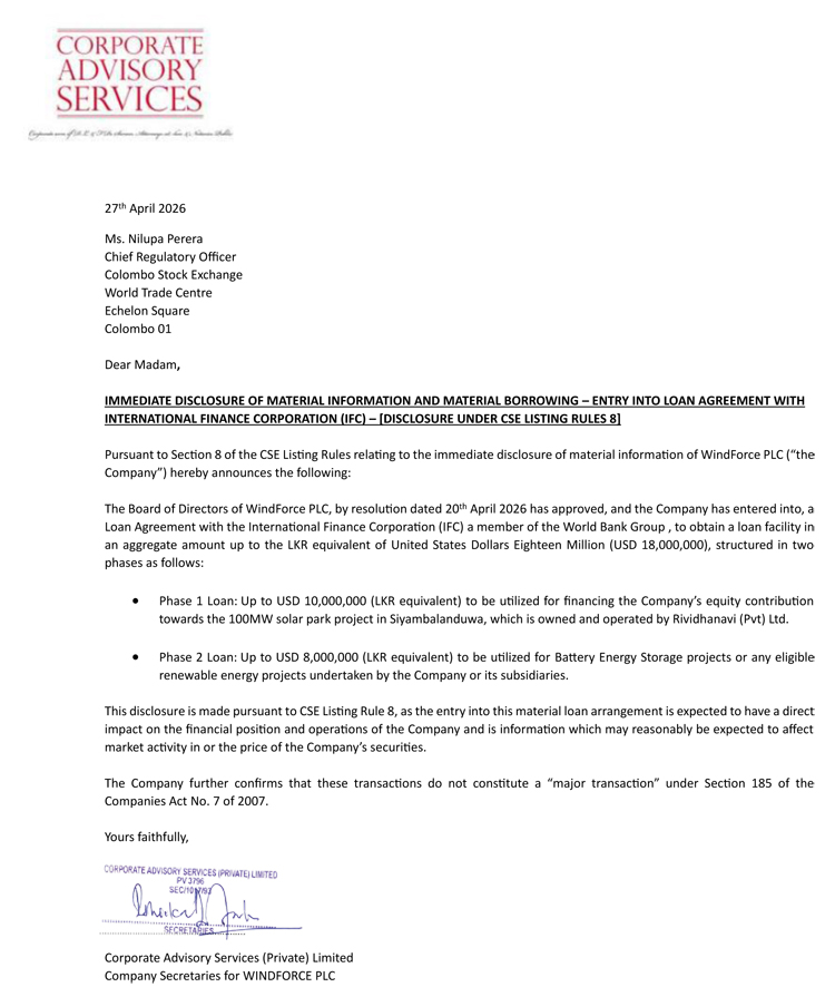 මෙරට ප්රමුඛතම ලැයිස්තුගත පුනර්ජනනීය බලශක්ති සමාගමක් වන WindForce PLC, එක්සත් ජනපද ඩොලර් මිලියන 18ක මූල්ය පහසුකමක් ලබා ගැනීම වෙනුවෙන් ලෝක බැංකු සමූහයේ සාමාජික ආයතනයක් වන ජාත්යන්තර මූල්ය සහයෝගීතාව (International Finance Corporation - IFC) සමග ගිවිසුමකට එළඹ තිබේ.