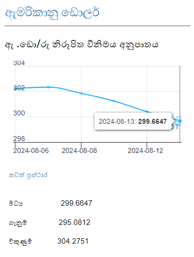 ශ්‍රී ලංකා මහ බැංකුවේ දෛනික විනිමය අනුපාතික සටහනට අනුව අද (13) දින එක්සත් ජනපද ඩොලරයේ නිරූපිත එතැන් විනිමය අනුපාතිකය (USD/LKR Spot Exchange Rate) රු. 299.66 ක් ලෙසින් වාර්තා වී තිබේ.