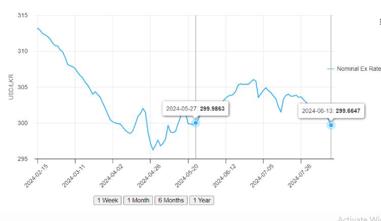 2024 මැයි 27 දිනෙන් පසු ඩොලරයේ නිරූපිත එතැන් විනිමය අනුපාතිකය රු. 300 සීමාවෙන් පහළට පැමිණි පළමු අවස්ථාව මෙය වේ.