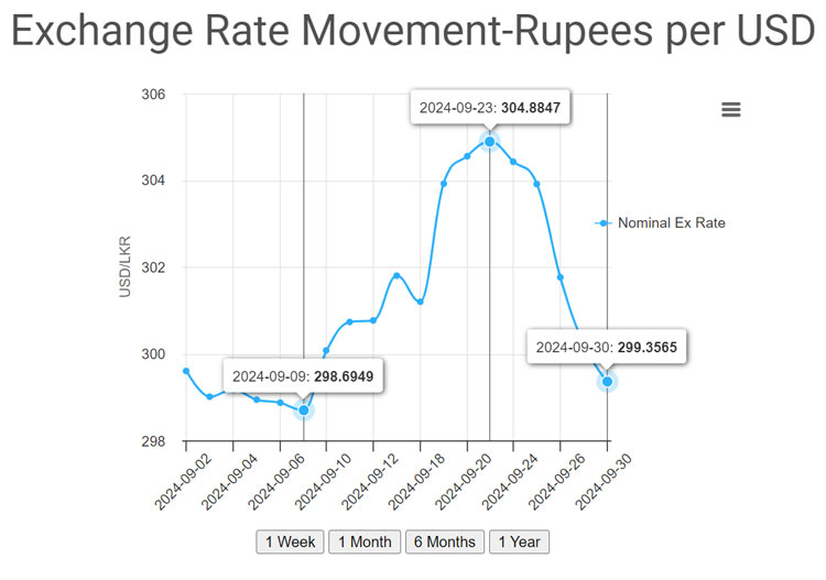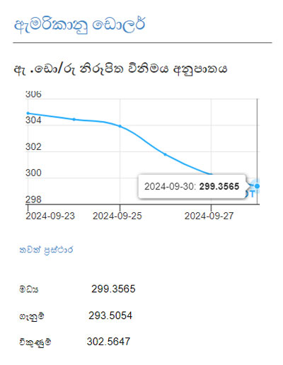 2024 සැප්තැම්බර් 09 දිනෙන් පසු ඩොලරයේ මධ්ය අගය රු. 300 සීමාවෙන් පහළට පැමිණි පළමු අවස්ථාව මෙයයි.
