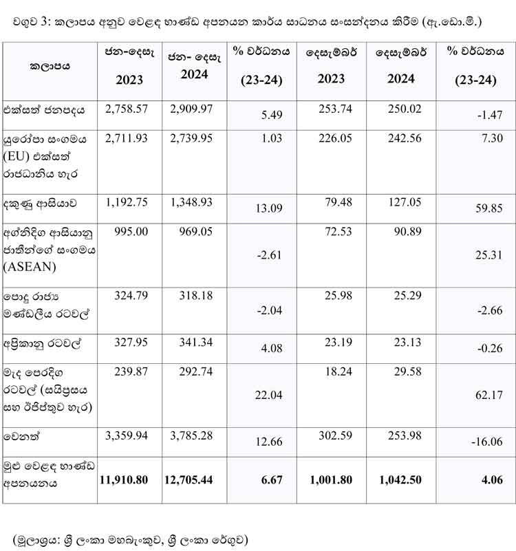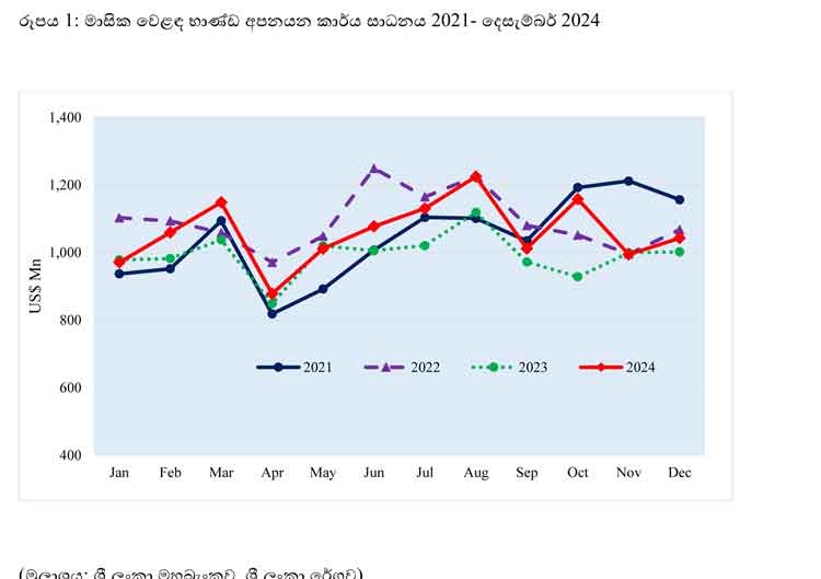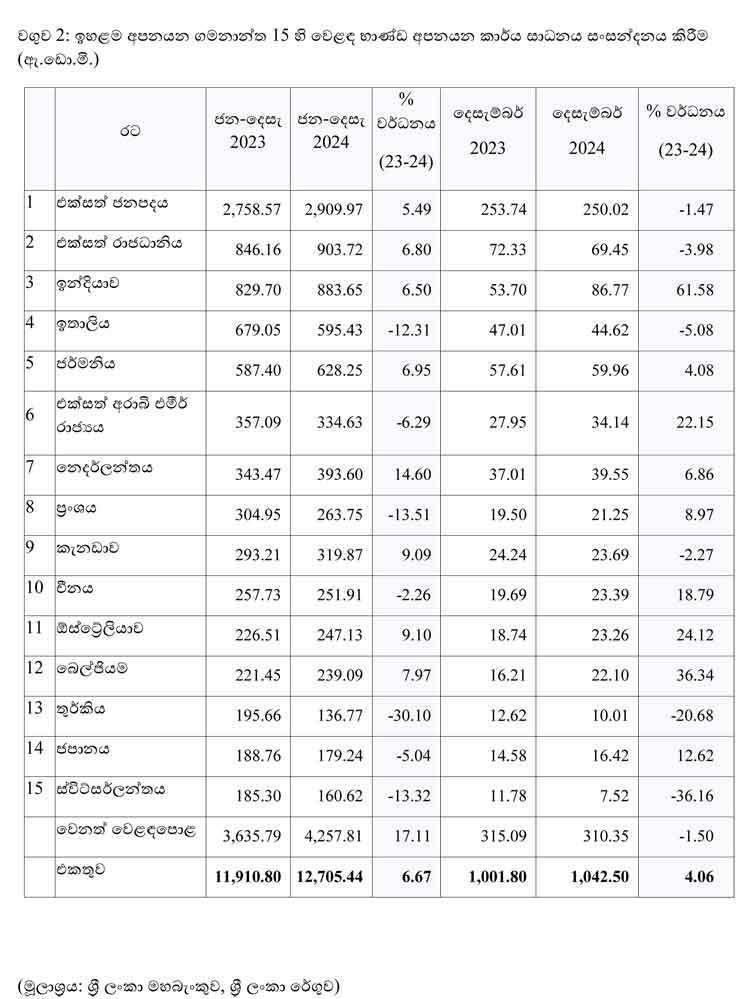 මේ අතර ශ්රී ලංකා රේගුව විසින් නිකුත් කරන ලද තාවකාලික දත්ත වලට අනුව, වෙළඳ භාණ්ඩ අපනයන කාර්ය සාධනය 2023 දෙසැම්බර් මාසයට සාපේක්ෂව 4.06% ක වැඩිවීමක් වන අතර 2024 දෙසැම්බර් මස වන විට ඇමෙරිකානු ඩොලර් මිලියන 1,042.5 ක්බව ශ්රී ලංකා අපනයන සංවර්ධනය මණ්ඩලය වැඩිදුරටත් සඳහන් කරයි.