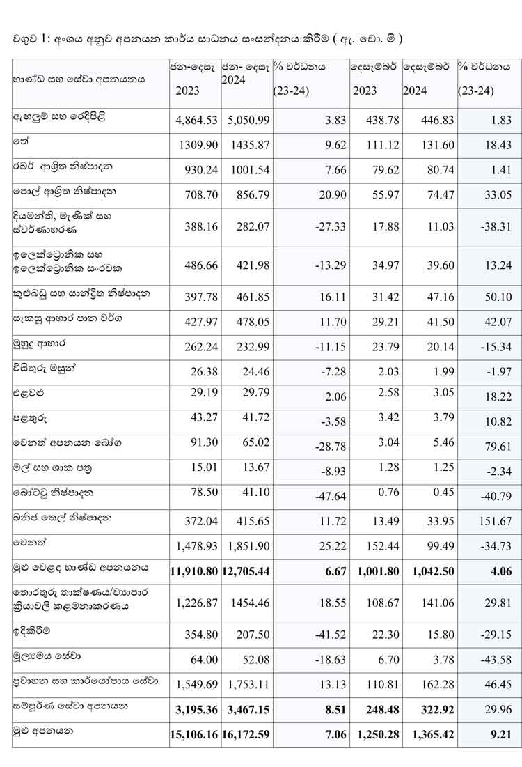 “එහි ප්රතිඵලයක් වශයෙන් වෙළඳ භාණ්ඩ සහ සේවා ඇතුළුව 2024 දෙසැම්බර් මාසය සඳහා වූ මුළු අපනයනය ඇමෙරිකානු ඩොලර් මිලියන 1,365.42කි. එය 2023 එම කාල සීමාවට සාපේක්ෂව 9.21%ක වැඩිවීමකි.“