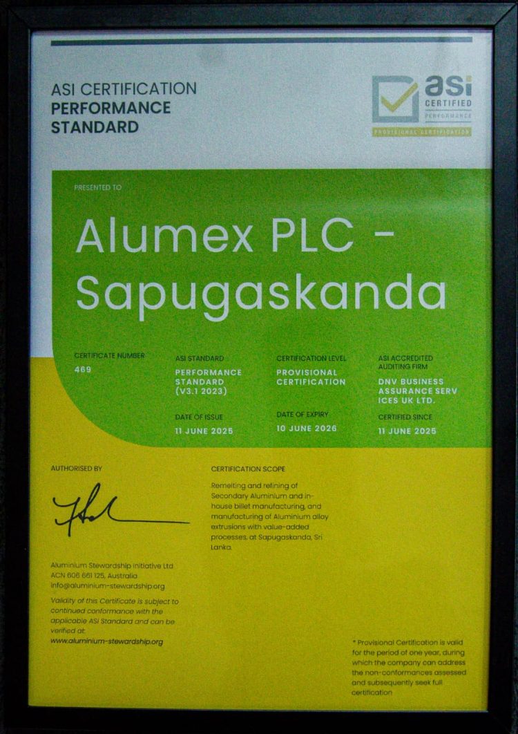 ශ්රී ලංකාවේ ප්රමුඛතම ඇලුමිනියම් ආස්තරණ නිෂ්පාදන ආයතනය වන Alumex PLC විසින් පසුගියදා ASI කාර්ය සාධන ප්රමිතී සහතිකය ( Performance Standards Certification ) ලබාගැනීමට සමත්විය. මේ සමඟ තිරසාර ඇලුමිනියම් නිෂ්පාදනය සඳහා ගෝලීය වශයෙන් පිළිගත් මෙම සහතිකය ලද ශ්රී ලංකාවේ ප්රථම සමාගම බවට Alumex PLC පත් වේ.