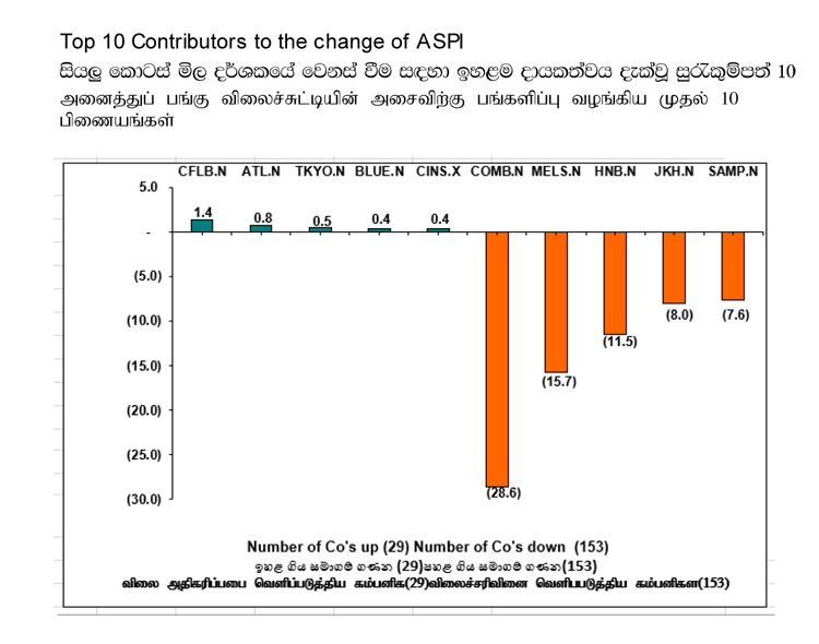 කොමර්ෂල් බැංකුව. මෙල්ස්ටාකොප්, HNB, ජෝන් කීල්ස් හෝල්ඩිංග්ස් සහ සම්පත් බැංකුව යන සමාගම්වල කොටස් මිල ගණන් පහළ යාම් සියලු කොටස් මිල දර්ශකයේ කඩා වැටීමට බෙහෙවින් බලපා තිබුණි. එසේම සමාගම් 153 ක කොටස් මිල ගණන් අද දින පහළ ගොස් තිබෙන අතර මිල ගණන් ඉහළ ගොස් තිබුණේ සමාගම් 29 ක පමණි.