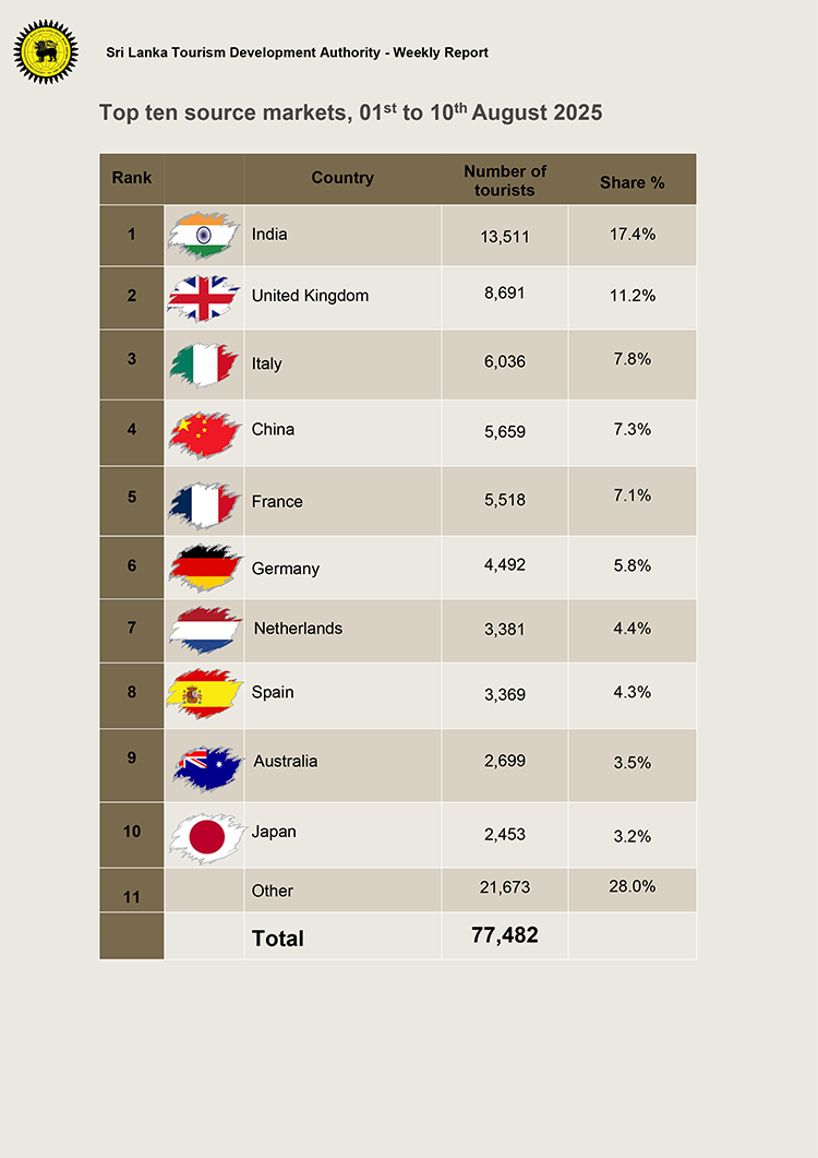 අගෝස්තු මාසයේ පළමු දින 10 තුළ දී 77,482ක සංචාරකයින් පිරිසක් මෙරටට පැමිණ ඇති බව ශ්රී ලංකා සංචාරක සංවර්ධන අධිකාරිය පවසයි.
