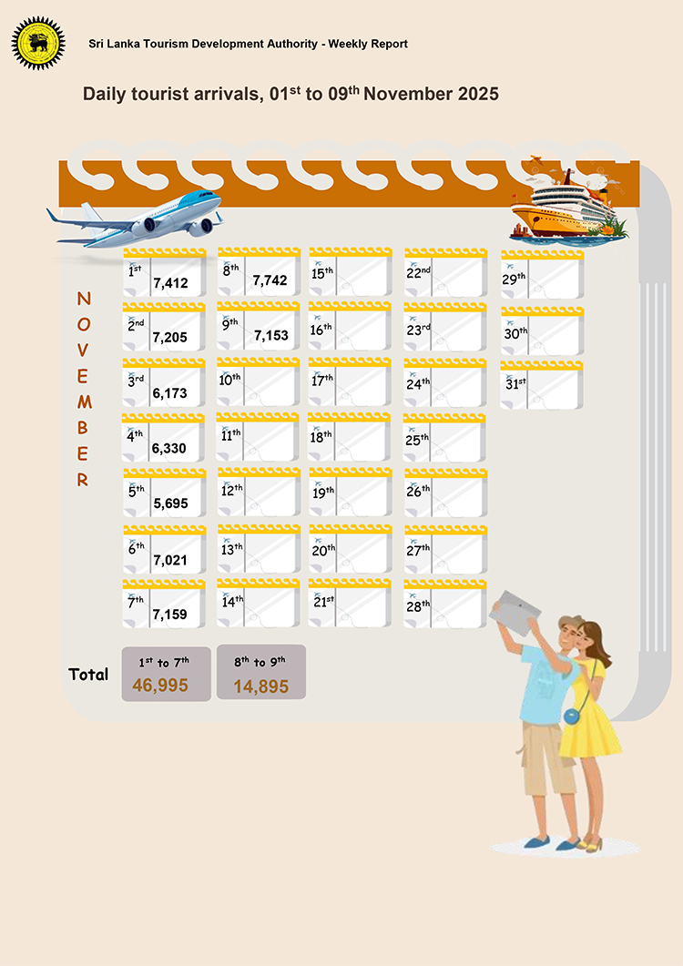 2025 වසරේ නොවැම්බර් පළමු දින 9 තුළ 61,890ක සංචාරකයින් පිරිසක් මෙරටට පැමිණ ඇති බව වාර්තා වෙයි.