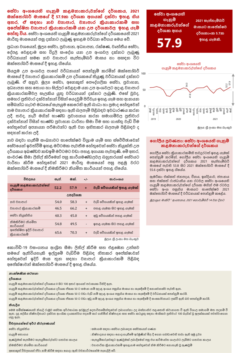 සේවා අංශයෙහි ගැනුම් කළමනාකරුවන්ගේ දර්ශකය, 2021 ඔක්තෝබර් මාසයේදී 57.9ක දර්ශක අගයක් දක්වා ඉහළ ගිය අතර, ඒ සඳහා නව ව්යාපාර, ව්යාපාර ක්රියාකාරකම් සහ අපේක්ෂිත ව්යාපාර ක්රියාකාරකම් යන උප දර්ශකවල ඉහළ යෑම් හේතු විය.