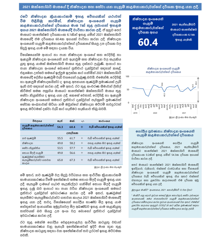 රටේ නිෂ්පාදන ක්රියාකාරකම් ඉහළ වේගයකින් යථාවත් වීම පිළිබිඹු කරමින්, නිෂ්පාදන අංශයෙහි ගැනුම් කළමනාකරුවන්ගේ දර්ශකය මාස 7ක් තුළ ලබාගත් ඉහළම අගය 2021 ඔක්තෝබර් මාසයේදී වාර්තා කරන ලදී.