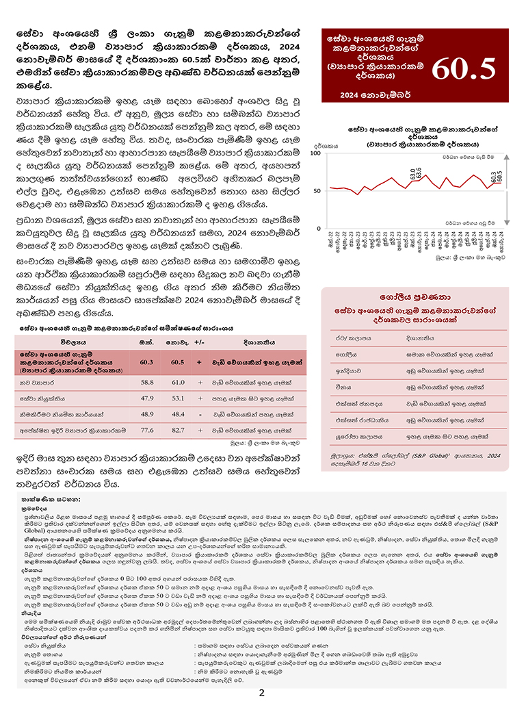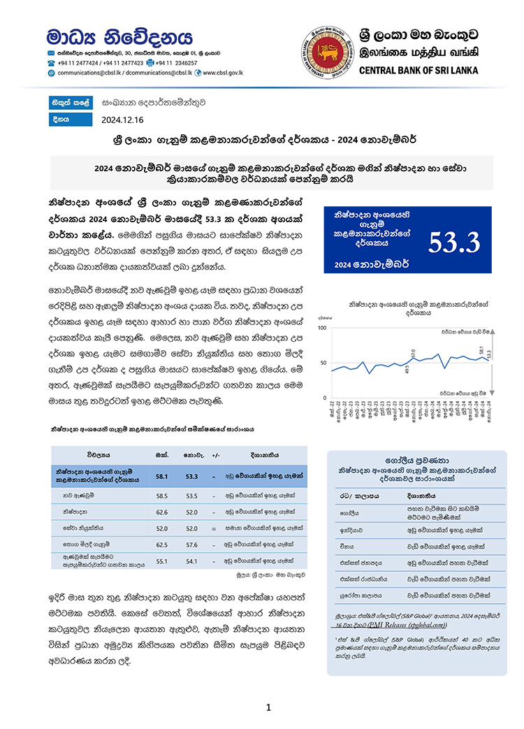 2024 නොවැම්බර් මාසයේ ගැනුම් කළමනාකරුවන්ගේ දර්ශක මගින් නිෂ්පාදන හා සේවා ක්රියාකාරකම්වල වර්ධනයක් පෙන්නුම් කරයි