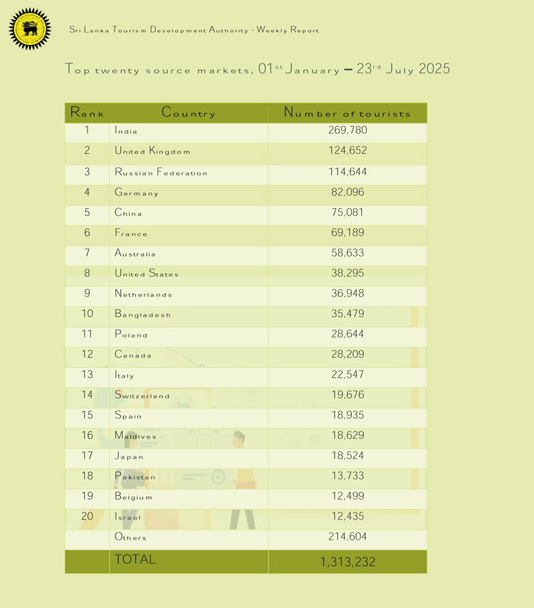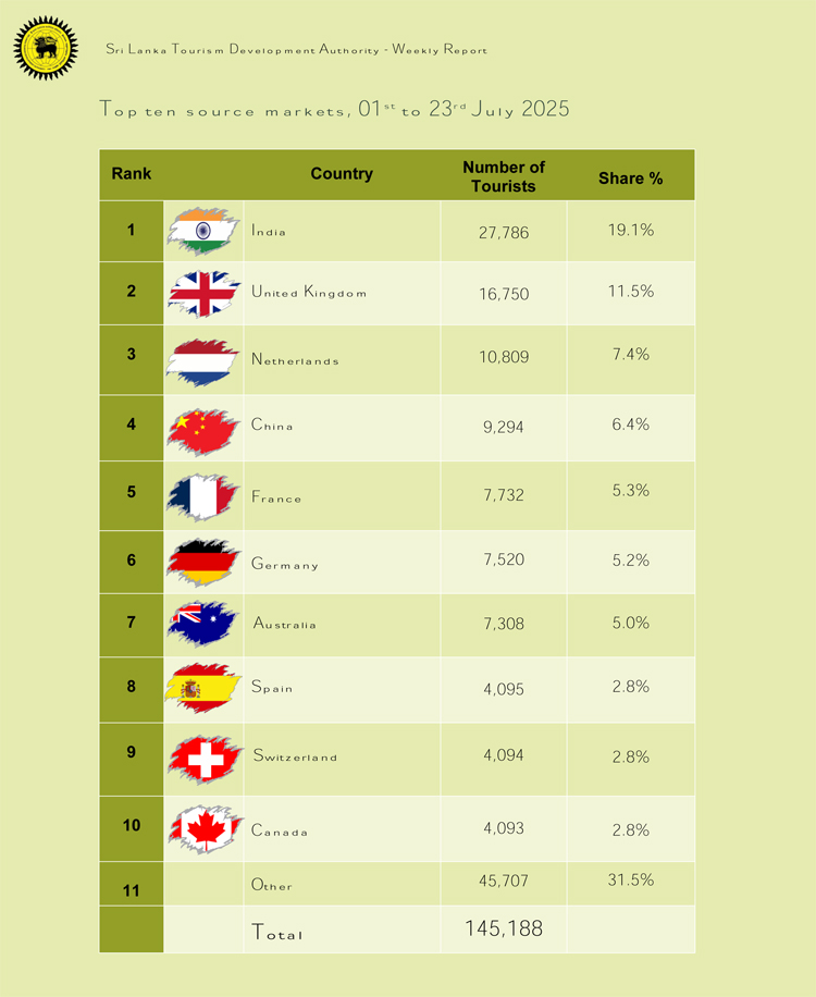 ශ්‍රී ලංකා සංචාරක සංවර්ධන අධිකාරිය විසින් නිකුත් කරන ලද නවතම වාර්තාවකට අනුව 2025 ජූලි මාසයේ පළමු දින 23 තුළ දී මෙරටට පැමිණ ඇති සමස්ත විදෙස් සංචාරකයින් සංඛ්‍යාව 145,188 ක් ලෙසින් දැක්වෙන අතර එහිදී ඉන්දියාවට (27,786) සහ එක්සත් රාජධානියට (16,750) පසු තෙවැනියට වැඩියෙන්ම සංචාරකයින් පැමිණ රට ලෙසින් නෙදර්ලන්තය (10,809) සටහන්ව ඇත. මෙය ජූලි මාසයේ මේ දක්වා මෙරටට පැමිණි මුළු සංචාරකයින් ප්‍රමාණයෙන් 7.4%ක් වේ.