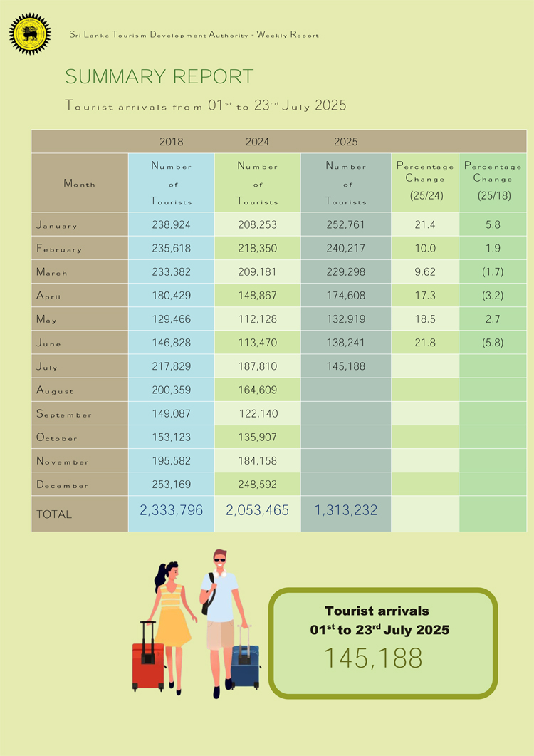 මේ අතර ශ්‍රී ලංකා සංචාරක සංවර්ධන අධිකාරිය නිකුත් කරනු ලැබූ නවතම නිල දත්ත වාර්තාවන්ට අනුව වසරේ මේ දක්වා මෙරටට පැමිණ ඇති සමස්ත සංචාරකයින් සංඛ්‍යාව දහතුන් ලක්ෂයේ සීමාව ඉක්මවා යමින් 1,313,232ක් ලෙසන් සටහන්ව ඇත.
