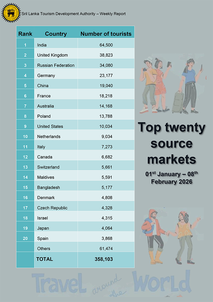 පෙබරවාරි මාසයේ පළමු දින 8 තුළ ඉන්දියාවෙන් සංචාරකයින් 12,439ක් එක්සත් රාජධානියෙන් 9,283ක් රුසියාවෙන් 6,946ක් සහ ජර්මනියෙන් 5,401ක් ලෙස වැඩි වශයෙන් සංචාරකයින් මෙරටට පැමිණ ඇත.